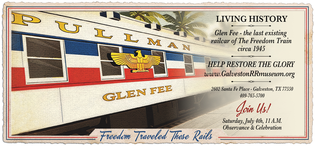 The Galveston Railroad Museum is home to the only remaining rail car that traveled to all 48 states in the Union, 1947 – 1949, as part of the first Freedom Train. All that remains of The Freedom Train is the Glen Fee at the museum. A fundraising campaign is currently underway to complete the restoration. The exterior has been painted in the traditional red, white and blue, the magnificent American Eagle is prominently displayed on the car, and new windows have been installed, however, much needs to be done to complete the interior that will feature documents and U.S. Marine uniforms circa 1945 – 1947.